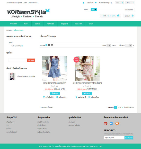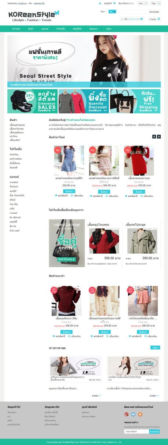 รูปแบบร้านค้าออนไลน์ เน้นการใช้โทนสีเขียว สีฟ้า ให้ความรู้สบายตา แต่คงไว้ด้วยรูปแบบที่ทันสมัย เหมาะกับการขายสินค้าแฟชั่นเสื้อผ้า กระเป๋า หรือเครื่องประดับ